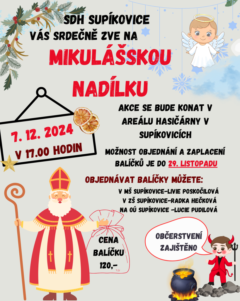 Akce se bude konat v areálu hasičárny v Supíkovicích v sobotu 7. prosince 2024 od 17 hodin. Více informací na plakátech.