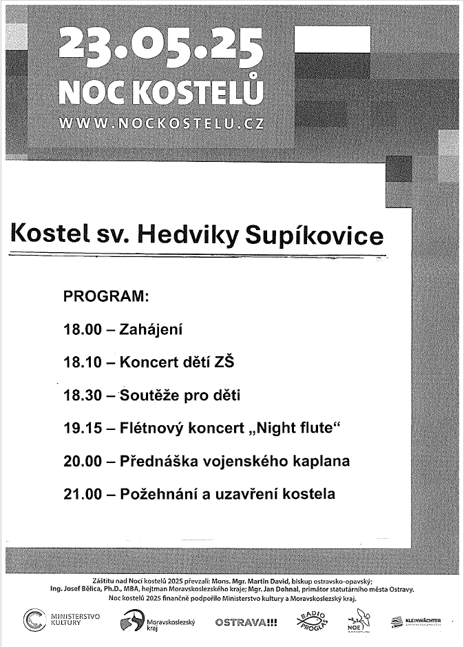 Plakát pro akci Noc kostelů v Supíkovicích V KOSTELE SV. HEDVIKY OD 18 HODIN