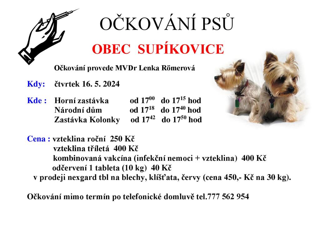 OČKOVÁNÍ PSŮ - OBEC SUPÍKOVICEPlakát pro Očkován psů v obci Supíkovice ve čtvrtek 16. května 2024 od 17 do 17:50 hodin. Misto a čas uvedeny na plakátu.