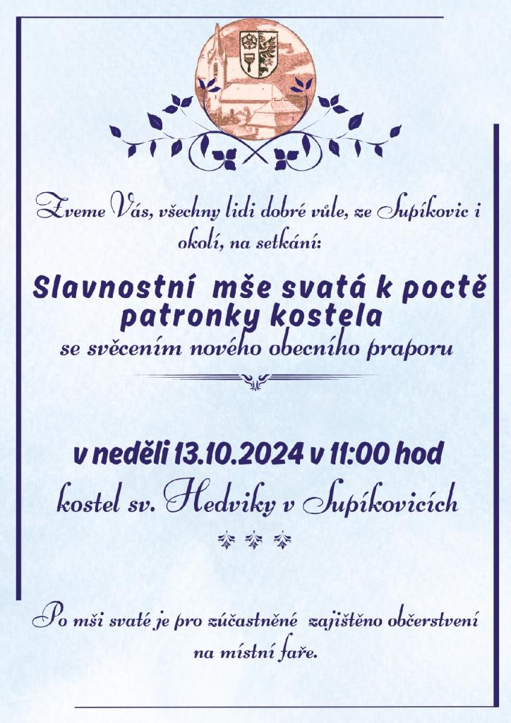 Plakát na akci "Slavnostní mše svatá k poctě patronky kostela se svěcením nového obecního praporu", která proběhne v kostele sv. Hedviky v Supíkovicích v neděli 13. října 2024 v 11 hodin Slavnostní mše svatá k poctě patronky kostela (sv. Hedvika) se svěcením nového obecního praporu