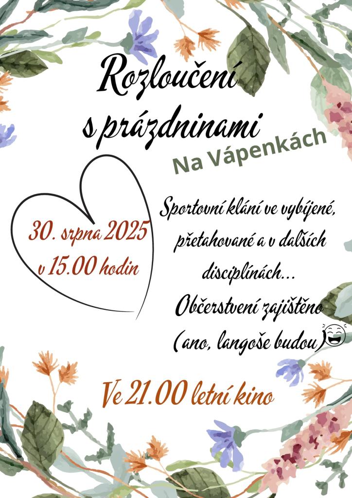 V sobotu 30. srpna 2025 od 15:00 se na Vápenkách koná rozloučení s prázdninami. Těšit se můžete na sportovní klání ve vybíjené, přetahované a dalších disciplínách. Občerstvení bude zajištěno, a to včetně oblíbených langošů. Akce vyvrcholí letním kinem, které začne ve 21:00.