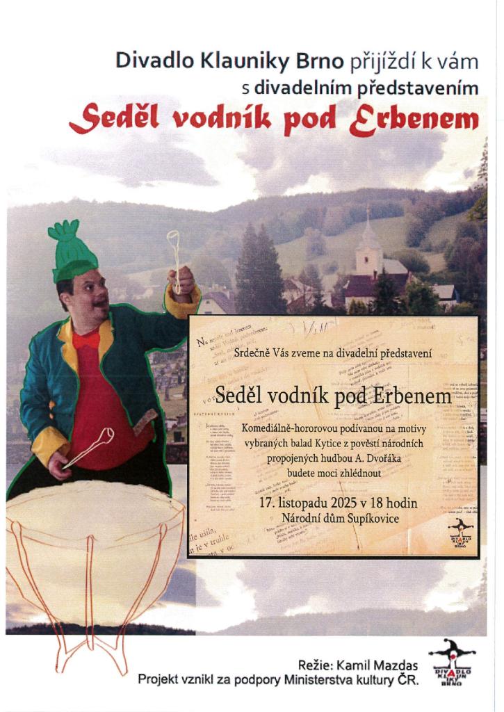 komediálně-hororovou podívanou na motivy vybraných balad Kytice z pověstí národních, propojených hudbou Antonína Dvořáka, kterou Vám představí v pondělí 17. listopadu 2025 v 18 hodin v Kulturním domě Supíkov